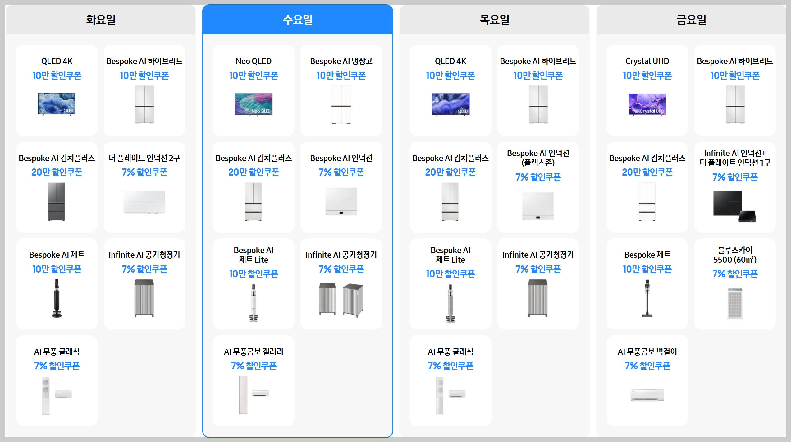 A2. 삼성전자는 TV·냉장고·스마트폰·PC 등 약 30여 개 제품군을 대상으로 최대 약 50% 할인 혜택을 안내하고 있습니다.