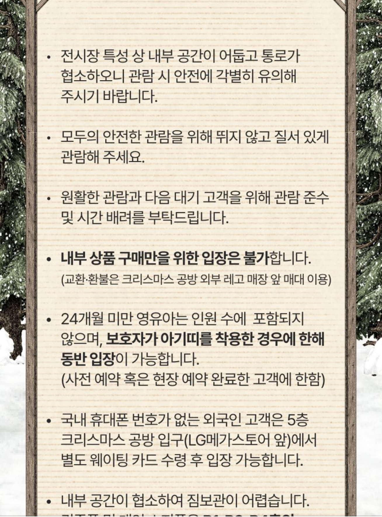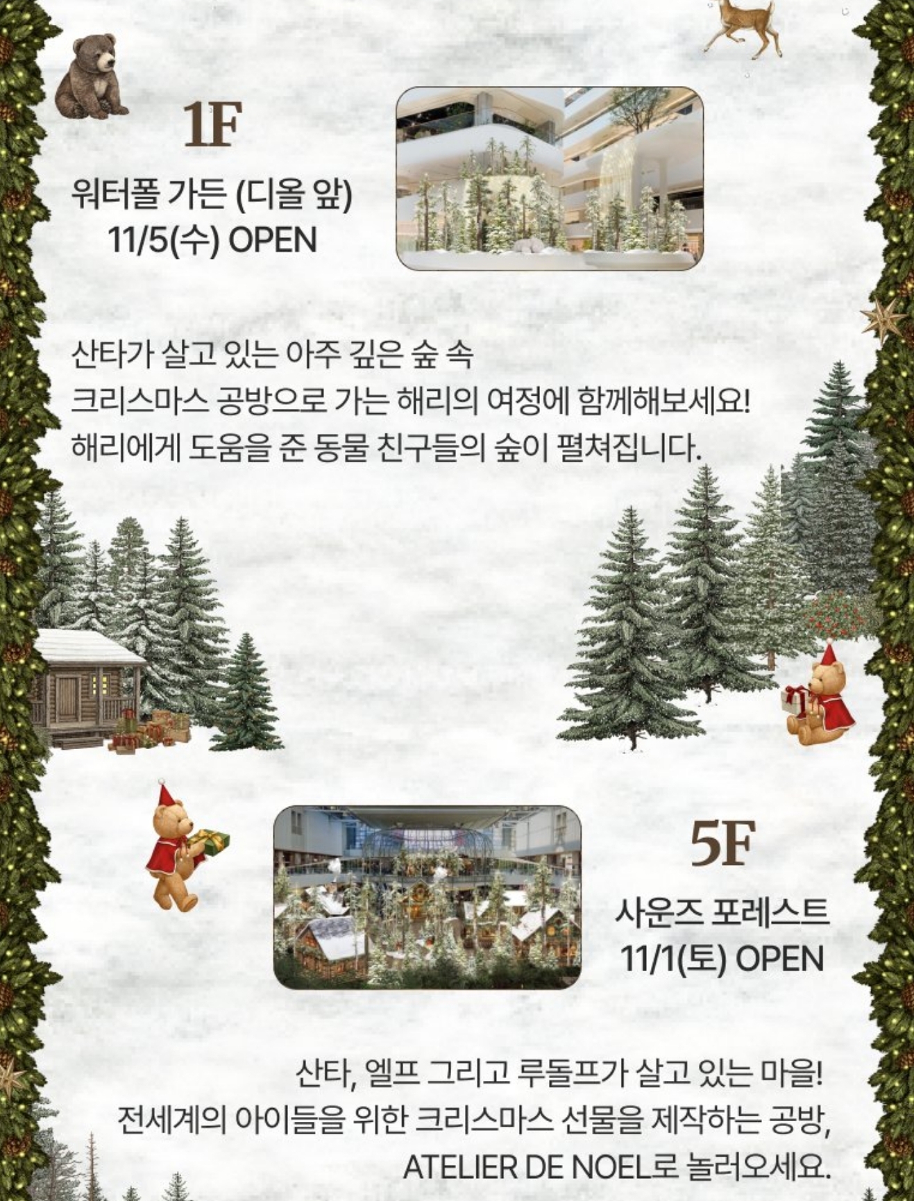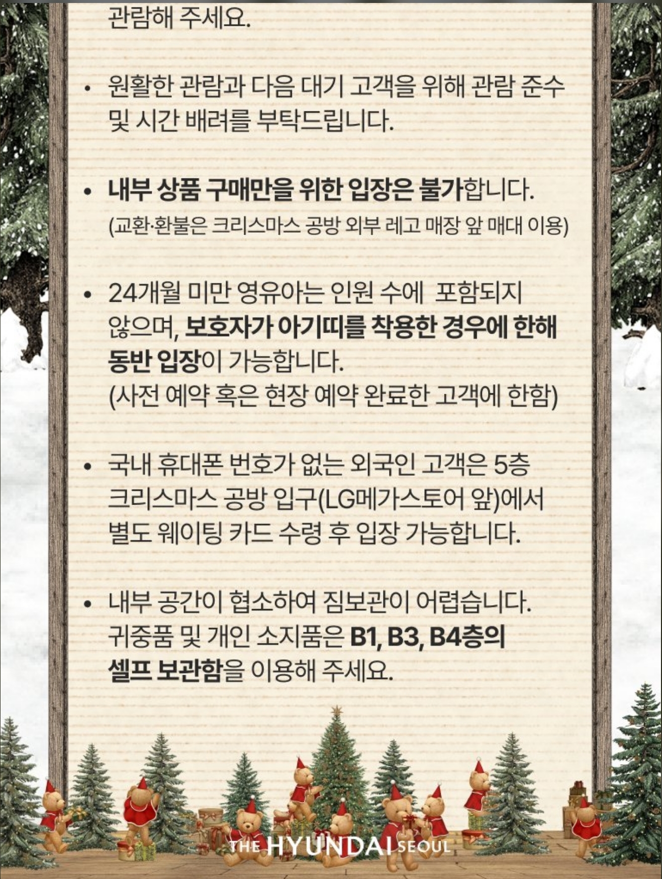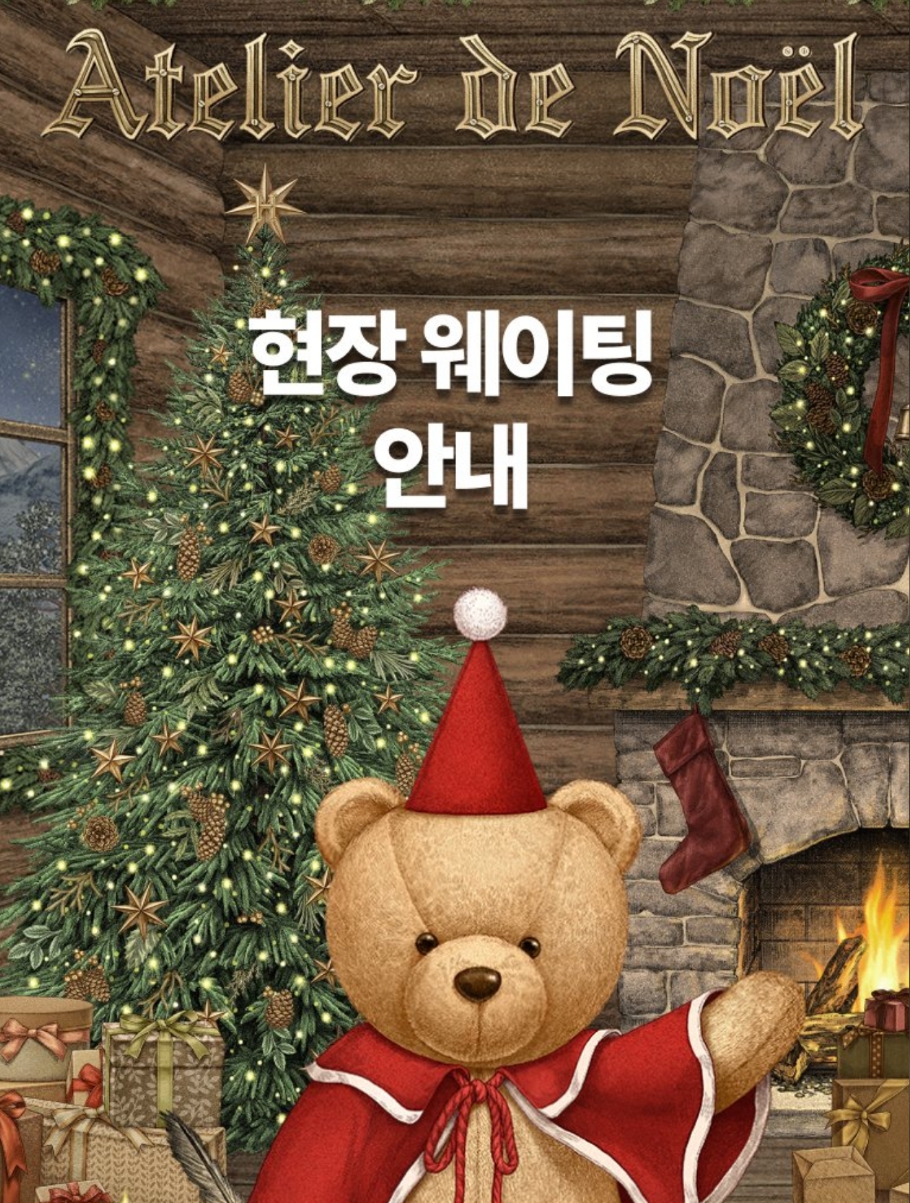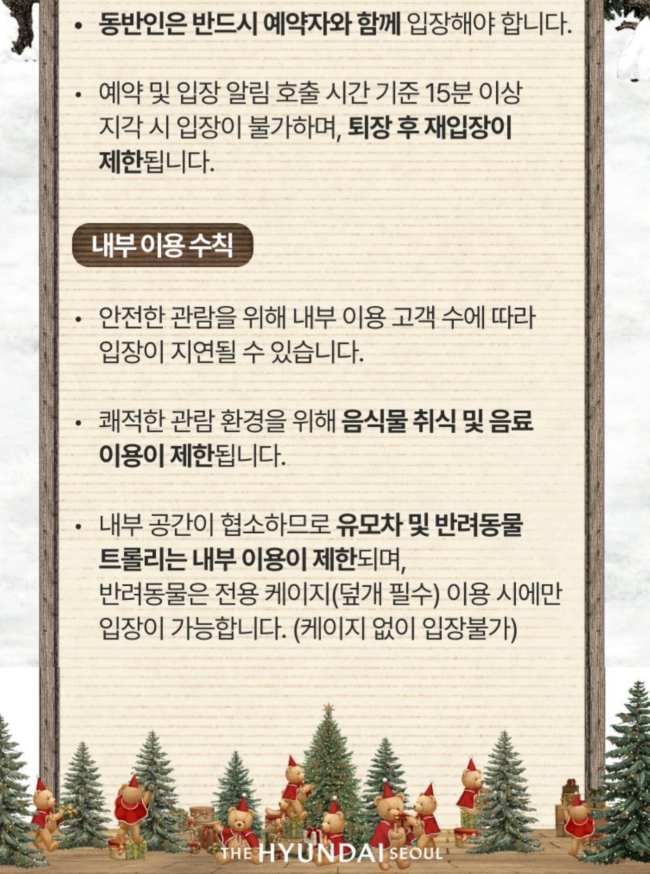 행사장은 더현대 서울 5층 사운즈포레스트 구역에서 진행되며, 입장 인원 제한이 있어 쾌적하게 관람할 수 있습니다. 내부에는 ‘산타의 공방’, ‘루돌프 존’, ‘포장 공방’ 등 다양한 테마존이 구성되어 있어 동선에 따라 즐길 거리가 달라져요. 입장 후 바로 굿즈샵과 포토존이 이어지므로, 사진을 먼저 찍고 여유롭게 구경하는 걸 추천합니다. 또, 내부 조명이 화려하기 때문에 카메라보다 스마트폰 자동 모드로 찍는 게 더 자연스럽게 나와요.