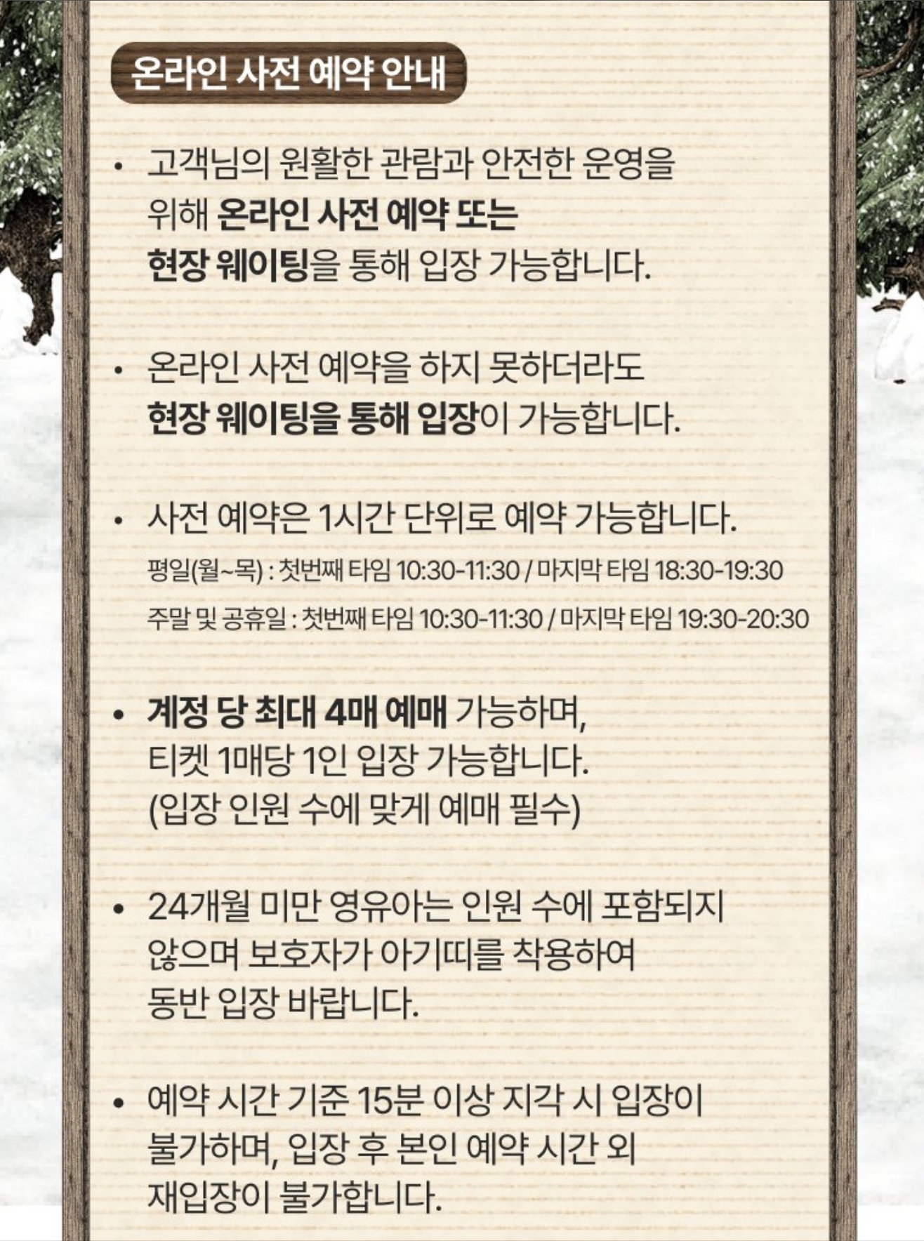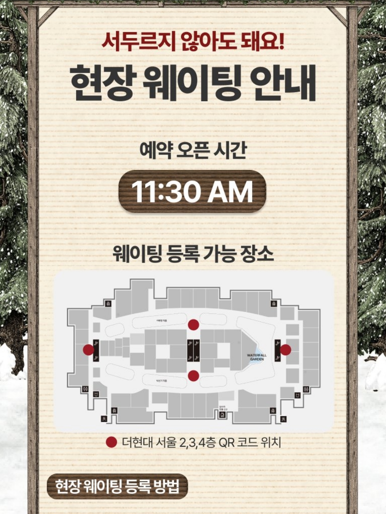 더현대 크리스마스 예약은 경쟁이 치열하기 때문에 몇 가지 팁을 알아두면 도움이 됩니다. 우선 예약 오픈 10분 전에는 미리 로그인해 두세요. 브라우저 새로고침을 반복하며 대기하면 접속 성공률이 높아집니다. 주말 오후 시간대는 가장 빨리 마감되므로, 평일이나 오전 타임을 노리는 것도 좋은 전략이에요. 혹시 예약에 실패하더라도, 현장 대기자 명단에 이름을 올리면 취소분 입장이 가능한 경우도 있습니다.