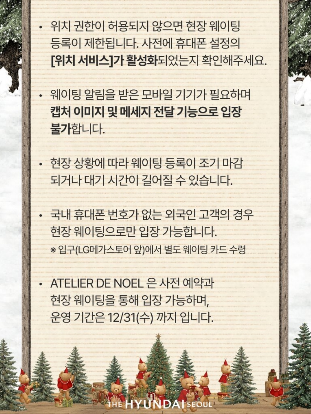 연말의 따뜻한 감성을 가장 세련되게 느낄 수 있는 곳, 바로 더현대 서울 크리스마스 빌리지입니다. 더현대 서울 크리스마스 빌리지 예약을 미리 해두면 여유롭게 입장하고, 복잡한 인파 속에서도 나만의 크리스마스 분위기를 즐길 수 있어요. 사랑하는 사람과 함께 반짝이는 조명 아래에서 한 해의 마지막 추억을 만들어보세요.
