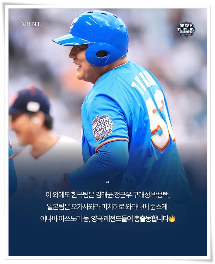 지금까지 2025 한일드림플레이어즈 중계 일정 및 선수 명단에 대해 정리해 봤습니다. 2025 한일드림플레이어즈는 ‘세대를 아우르는 야구 축제’라는 말이 가장 잘 어울립니다. 김태균, 이종범, 이대호, 구대성 등 한국의 전설들이 다시 유니폼을 입고, 일본의 레전드들과 맞붙는 이 무대는 단순한 경기 이상입니다. 야구팬이라면 중계로 보든, 직접 직관을 가든, 이 특별한 경기를 절대 놓쳐서는 안 될 것입니다. 11월 30일, 에스콘필드 홋카이도에서 다시 시작될 레전드들의 이야기를 함께 지켜보세요.