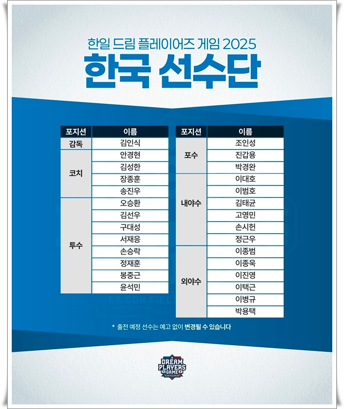 2025 한일드림플레이어즈 게임의 모든 정보를 알아보세요. 한국팀 명단, 일본팀 명단, 티켓 예매 방법, TV중계 채널, 직관 팁까지 완벽 가이드입니다.