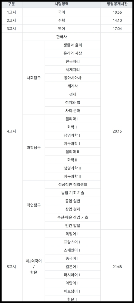 현재 수능 문제 공개 시간과 정답 발표 시간이 정확하게 공개 되었는데요~ 수능 문제 공개 시간과 수능 정답 발표 시간은 국어 오전 10시 56분 / 수학 14시 10분 / 영어 17시 04분 / 사탐,과탐,직업탐구는 20시 15분 / 제2외국어 및 한문은 21시 48분으로 명시되었습니다. 수능 정답 발표 시간은 매년 동일한 패턴을 따르고 있는데요~ 한국교육과정평가원은 시험이 끝난 당일 공식 홈페이지를 통해 문제지와 정답지를 함께 공개하고 있습니다.