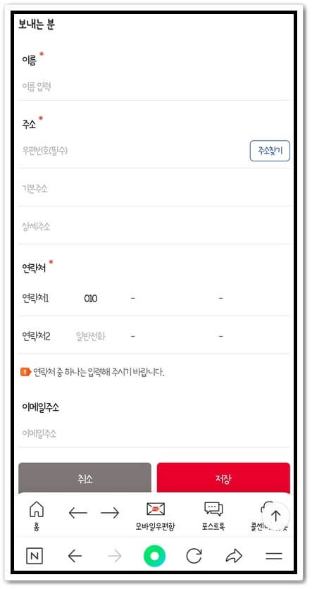 3. 보내는 사람과 받는 사람의 이름, 주소, 연락처를 정확하게 입력한 뒤 물품 크기와 무게를 선택합니다. (물품 크기와 무게를 선택하면 자동으로 요금이 계산됨)