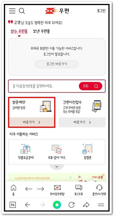 1. 홈페이지에 접속한 뒤 메인 페이지에서 방문 예약 버튼을 클릭합니다. 모바일 앱에서도 동일하게 우체국 택배 방문 접수 메뉴를 찾을 수 있습니다.