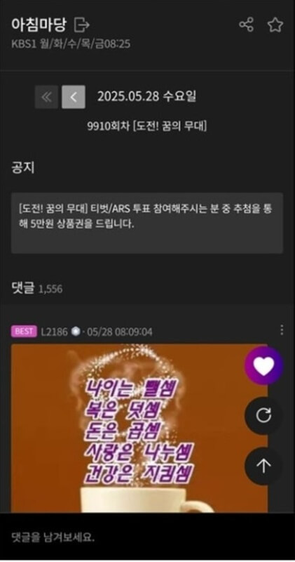 아침마당 방송 중 돌발퀴즈가 나오면 앱 화면에 퀴즈 참여 버튼이 활성화되는데요~ 보기 중 정답 번호를 선택 후 참여하기 버튼을 클릭하면 되고, 응모 완료 후 댓글로 응원 메시지 작성도 가능합니다. 무엇보다 티벗 앱은 전화보다 속도가 빠르고 동시에 댓글 이벤트에도 참여할 수 있기 때문에 당첨 기회가 두 배라고 생각하면 됩니다.