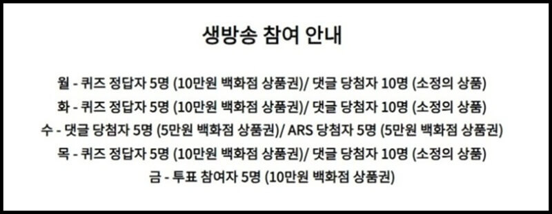 A6. 1회 방송당 1인 1회만 응모 가능합니다. 단, 요일별 퀴즈는 각각 참여할 수 있습니다.