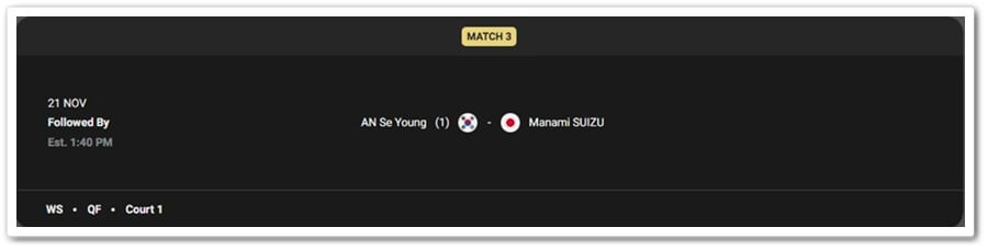 - 대진: 안세영 vs 인도네시아 푸트리 쿠수마 와르다니(7위)와 캐나다 미셸리(17위)의 승자