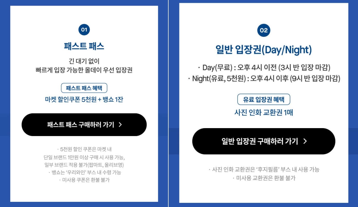 저녁 분위기를 즐기고 싶다면 나이트권(5,000원)이 제격입니다. 오후 4시 이후부터 입장이 가능하며, 현장에서 사용할 수 있는 포토 인화권 1매가 제공되어 인생샷을 남기기에 좋습니다. 마지막으로 데이권은 낮 시간대 무료로 입장할 수 있는 티켓으로, 비용 부담 없이 마켓을 둘러보고 싶은 분들에게 추천됩니다. 단, 사전 예약은 필수이며 현장 대기 인원이 많을 수 있습니다.