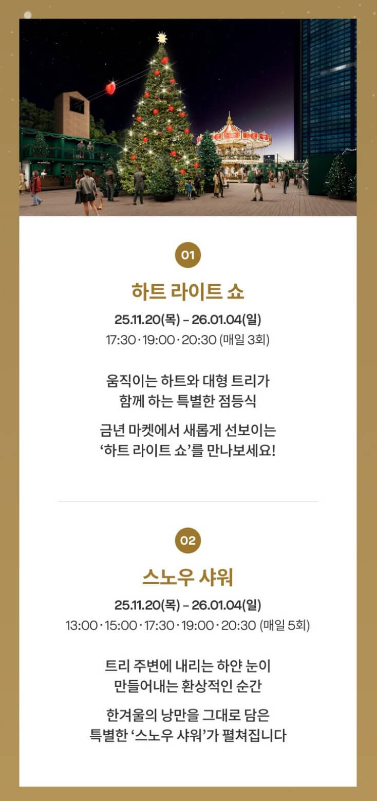 주말에는 더 늦게까지 머물 수 있어 여유롭게 관람할 수 있죠. 매일 오후에는 13미터 트리 아래에서 하트 라이트 쇼가 진행되고, 일정 시간마다 인공 눈이 내리는 스노우 샤워도 펼쳐집니다. 유럽 현지 분위기를 고스란히 느낄 수 있는 체험 부스와 포토존도 다양하게 구성되어 있어 가족, 연인, 친구 단위 방문객 모두 즐길 거리가 풍성합니다.