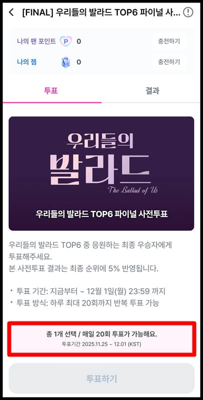 현재 파이널에 앞서 진행 중인 우리들의 발라드 사전투표는 시청자의 선택이 직접 점수에 반영되는 방식으로 운영됩니다. 팬들은 LiNC 앱을 통해 하루 최대 20회까지 투표할 수 있으며, 유료·무료 투표 모두 참여자의 의지만 있다면 손쉽게 진행할 수 있습니다. 특히 투표는 생방송 전날인 12월 1일 밤 11시 59분까지 가능해 마지막까지 승부를 가를 중요한 변수로 평가되고 있습니다.