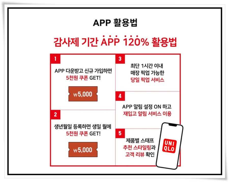또한 유니클로 앱을 활용하면 신규 가입 시 5천 원 쿠폰, 생일 등록 시 생일 쿠폰, 재입고 알림 설정, 제품 리뷰 확인 등 여러 기능을 이용할 수 있어 감사제 기간을 더욱 효율적으로 활용할 수 있습니다. 특히 앱으로 주문하면 당일 픽업 서비스도 제공되어 빠르게 상품을 수령할 수 있는 점이 큰 장점입니다.