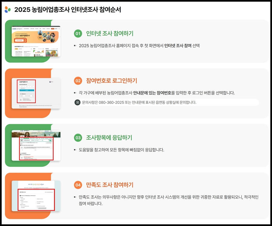 농림어업 총조사는 국가의 농림어업 정책 방향을 세우는 데 꼭 필요한 중요한 조사입니다. 최근에는 인터넷 조사 참여가 크게 확대되면서 농림어업 총조사 홈페이지를 통한 참여 방식이 가장 편리한 방법으로 자리 잡고 있습니다. 조사 문항은 어렵지 않으며, 약간의 시간만 투자하면 누구나 쉽게 진행할 수 있습니다. 정확한 통계는 참여자 한 분 한 분의 응답에서 만들어지니, 조사 안내문을 받으셨다면 인터넷 조사를 통해 빠르고 간편하게 참여해보시길 권해드립니다.