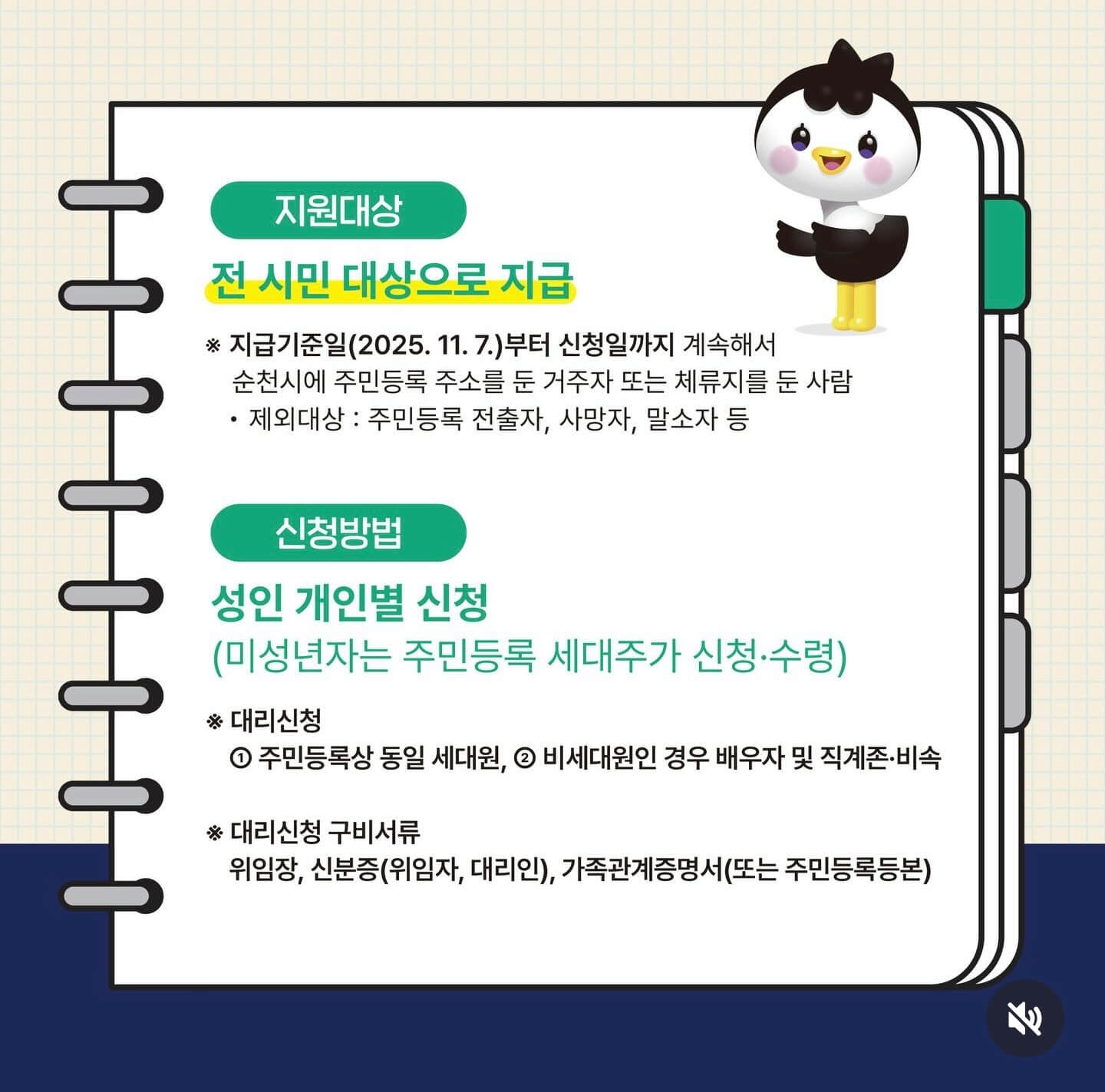 또 하나 중요한 점은 지원 대상 기준일(2025년 11월 7일)입니다. 이 날짜 기준으로 순천시에 주민등록이 되어 있어야만 지원금을 받을 수 있으므로, 기준일 이후 전입한 시민은 대상에서 제외됩니다. 신청 마감일인 12월 26일도 반드시 지켜야 합니다.