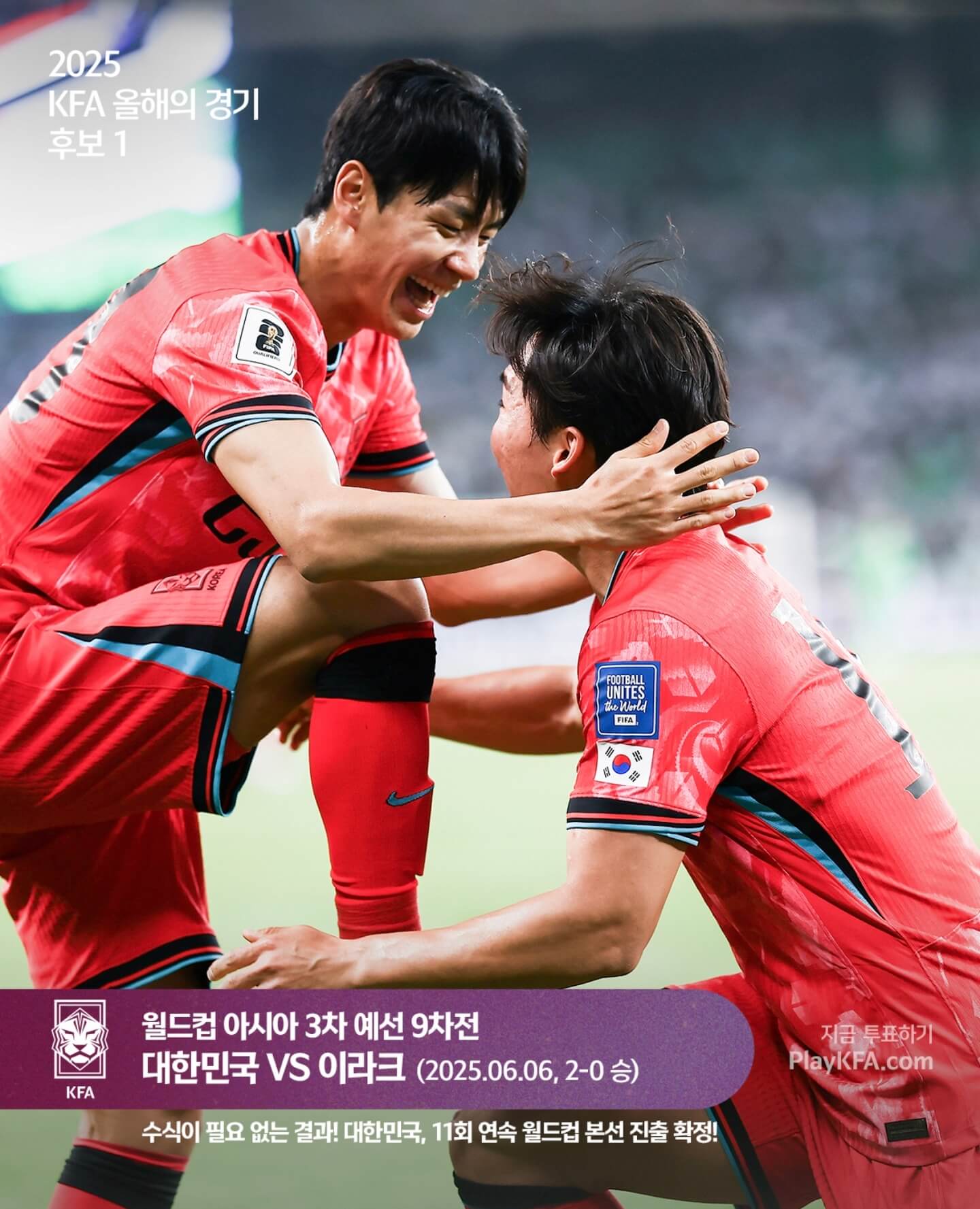 KFA 올해의 골 팬투표와 올해의 경기 팬투표는 팬들의 손으로 국가대표팀의 명장면을 기록하는 의미 있는 행사입니다. PlayKFA에서 간단하게 참여할 수 있으니 아직 투표하지 않았다면 꼭 참여해보시길 추천드립니다. 한 해 동안의 감동을 떠올리며 자신의 선택을 남기는 순간, 그 자체로 축구 팬으로서의 즐거움을 다시 한 번 느낄 수 있을 것입니다. 18일 마감 전까지 여유 있게 투표하시고, 22일 발표될 결과도 함께 기대해보세요.