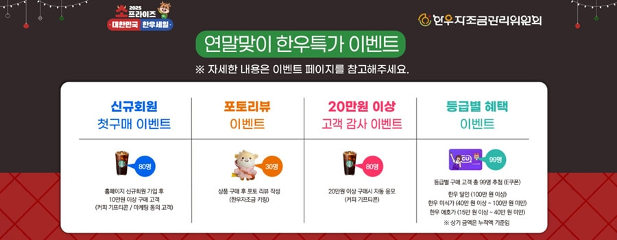 또한 20만 원 이상 구매 고객에게는 자동으로 커피 기프티콘이 제공되는 감사 이벤트가 적용되기 때문에 가족 단위 대량 구매자에게 특히 유리합니다. 등급별 누적 구매액에 따라 추가 추첨 혜택이 있는 등급별 이벤트 역시 꽤 매력적입니다. 연말 선물용으로 한우를 구매하는 사람들이 많아지는 시기라 이러한 혜택은 부담 없이 사용할 수 있는 장점이 있습니다.