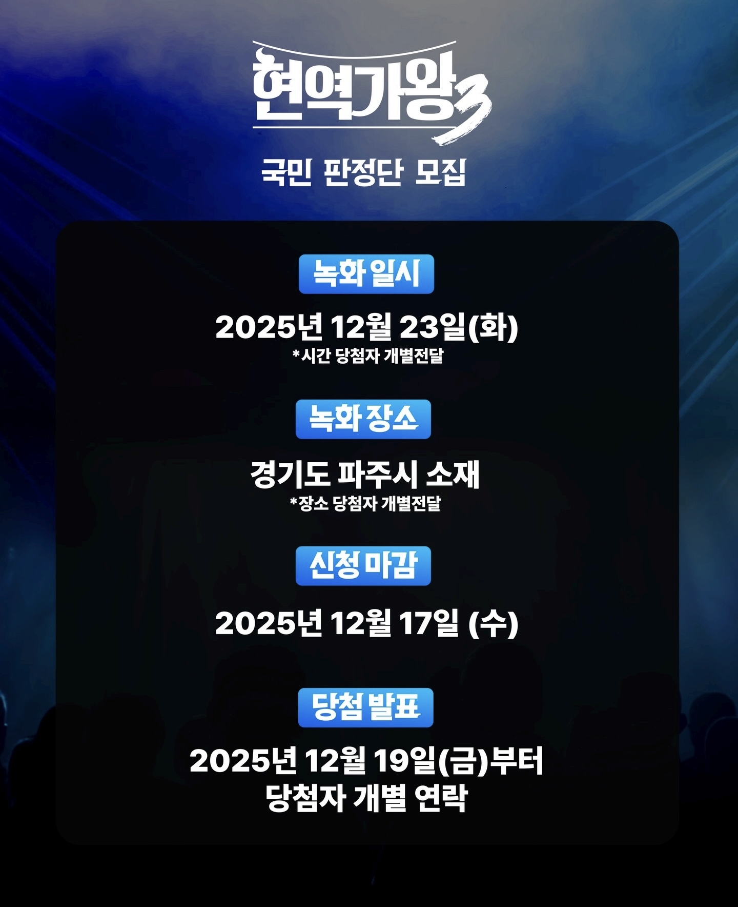 그렇게 현역가왕3 출연자 명단과 티저를 공개함과 동시에 국민판정단 모집을 시작했습니다. 현역가왕3 국민판정단 신청은 12워 17일(수)까지이며 녹화는 12월 23일(화)에 이뤄집니다. 누구보다 빠르게 현역가왕3 출연자 명단에 오른 현역가수들을 만나보고 싶다면 현역가왕3 국민판정단 신청하기를 해보셔도 좋을 것 같습니다.