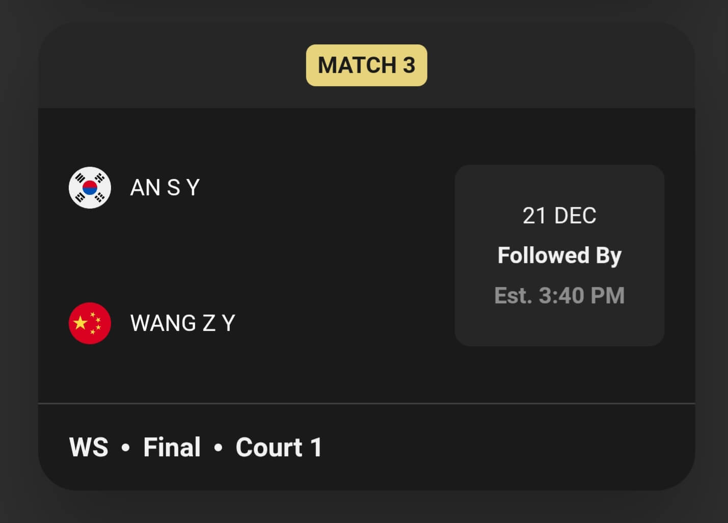 - 안세영 왕중왕전 결승 시간: 전체 결승전 세션은 오후 4시 40분(한국 시간)부터 시작되며, 안세영 선수의 경기는 세 번째 매치(MATCH 3)로 배정되었습니다.