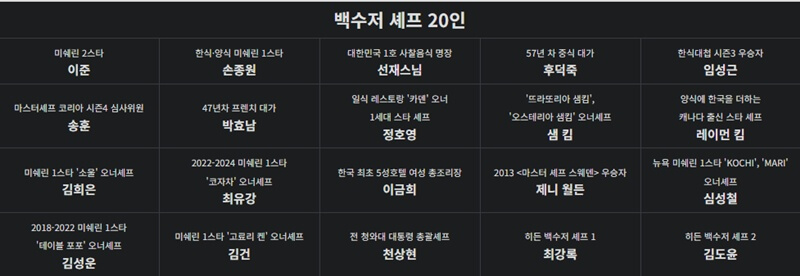 이번 시즌 백수저 라인업은 대한민국 요리계의 전설들이 대거 합류하여 화제를 모았습니다. 미쉐린 2스타 이준 셰프를 필두로 한식과 양식 모두에서 미쉐린 1스타를 획득한 손종원 셰프, 그리고 대한민국 1호 사찰음식 명장인 선재스님이 이름을 올렸습니다. 또한 57년 경력의 중식 대가 후덕죽 마스터와 한식대첩 우승자 임성근 셰프, 대중에게 친숙한 샘킴과 레이먼 킴, 정호영 셰프까지 가세하며 역대급 진용을 갖췄습니다. 이외에도 최강록, 김도윤 셰프가 히든 백수저로 깜짝 등장하여 팬들의 환호를 자아냈으며 각 분야를 대표하는 20인의 거장들이 보여주는 품격 있는 요리 세계는 매회 감탄을 불러일으키고 있습니다.