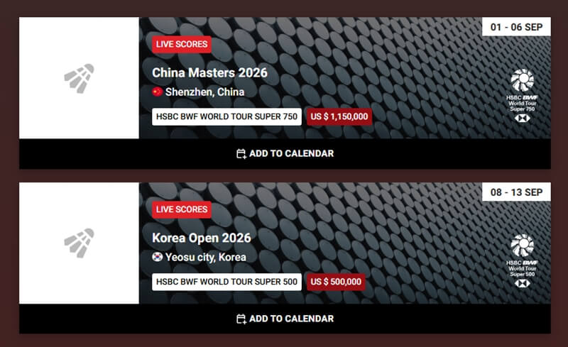2026년의 대미는 12월 중국 항저우에서 열리는 BWF 월드투어 파이널이 장식하며, 한 해 동안 가장 좋은 성적을 거둔 상위 8명만이 모여 진정한 왕중왕을 가리는 것으로 1년간의 긴 여정을 마무리하게 됩니다.