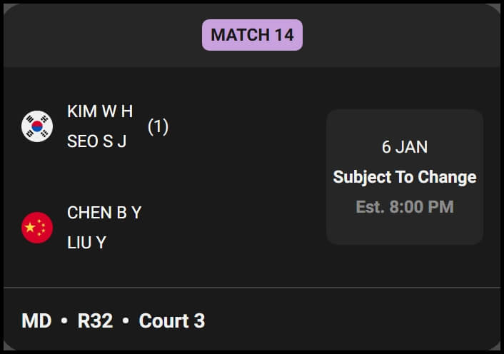 대회 첫날의 대미는 남자 복식 세계 랭킹 1위인 김원호-서승재 조가 장식합니다. 이들은 3번 코트의 열네 번째 매치(Match 14)에 배정되어 중국의 첸보양-리우이 팀과 피할 수 없는 한판 승부를 벌입니다. 예상되는 안세영 경기 중계 시간보다 훨씬 늦은 밤인 한국 시간 밤 9시경에 경기가 시작될 예정입니다. 다만 주최측은 상황에 따라 시간이 변동될 수 있음을 명시하고 있으므로, 저녁 식사 후 여유롭게 중계 채널을 확인하시며 태극전사들의 마지막 경기를 응원하시길 추천합니다.