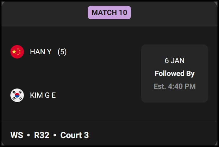 안세영 선수 외에도 대한민국 여자 배드민턴의 간판 김가은 선수가 출격을 대기하고 있습니다. 김가은 선수는 3번 코트의 열 번째 매치(Match 10)에 배정되어 중국의 강호 한웨(HAN Y)와 32강 맞대결을 펼칩니다. 안세영 경기 중계 시간이 오전인 것과 달리, 김가은 선수의 경기는 한국 시간으로 오후 5시 40분경에 시작될 예정입니다. 중국의 5번 시드 선수와 맞붙는 만큼 치열한 접전이 예상되며, 국내 팬들의 뜨거운 응원이 필요한 시점입니다.
