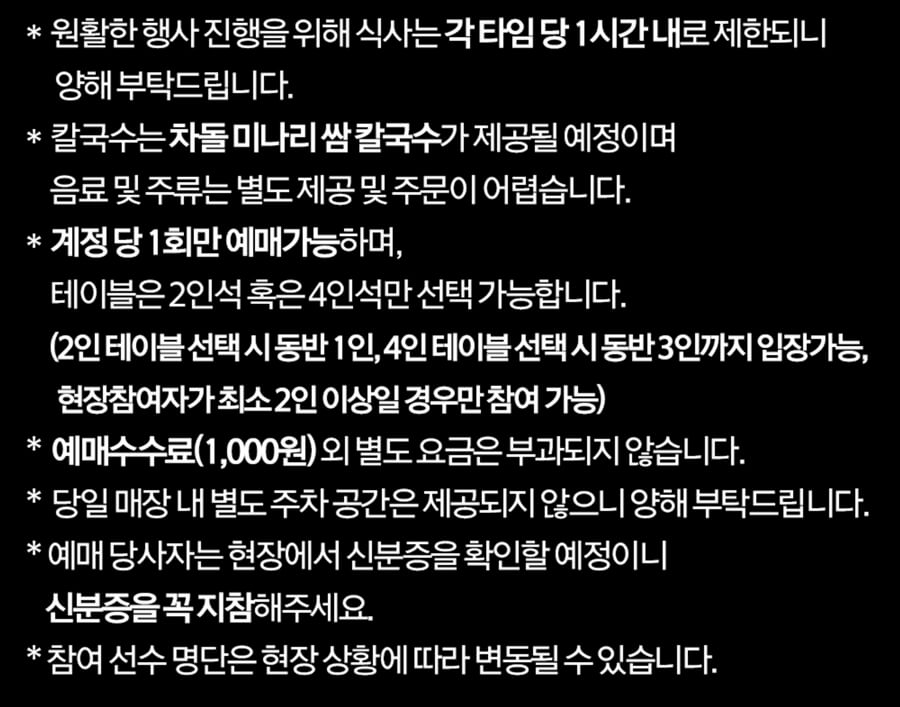 예매 시 테이블 선택에도 신중을 기해야 합니다. 계정 당 1회만 예매가 가능하며, 테이블은 2인석 혹은 4인석 중에서만 선택할 수 있습니다. 2인 테이블을 선택할 경우 본인 외 동반 1인까지 입장이 가능하고, 4인 테이블을 선택하면 동반 3인까지 함께할 수 있습니다. 중요한 점은 현장 참여자가 최소 2인 이상일 경우에만 참여가 가능하다는 것입니다. 즉, 혼자서 방문하는 것은 불가능하므로 반드시 함께할 친구나 가족을 미리 섭외해야 합니다. 한화이글스 공약 칼국수 이벤트 예매하기 과정에서 인원수에 맞는 테이블을 선점하는 것이 입장권 확보의 핵심입니다.