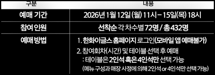 가장 중요한 한화이글스 칼국수 이벤트 예매 기간은 2026년 1월 12일 월요일 오전 11시부터 1월 15일 목요일 오후 6시까지입니다. 참여 가능한 인원은 각 차수별로 72명씩, 총 432명으로 매우 한정적이라 예매 오픈과 동시에 마감될 가능성이 높습니다. 주의해야 할 점은 예매가 모바일 앱에서는 불가능하고 오직 한화이글스 공식 홈페이지를 통해서만 진행된다는 사실입니다. PC를 통해 홈페이지에 로그인한 후 참여를 원하는 회차와 테이블을 선택해야 합니다. 한화이글스 공약 칼국수 이벤트 예매하기를 준비하시는 분들은 미리 PC 환경을 점검하고 회원가입 여부를 확인해 두는 것이 성공 확률을 높이는 방법입니다.