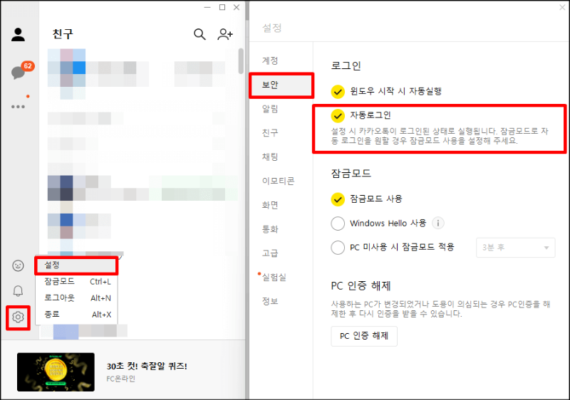 그런데 만약 공용 컴퓨터나 사무실 pc를 사용하는 경우 보안상 위험할수있기 때문에 자동로그인 기능도 꺼두는 것이 좋습니다. 자동로그인 해제는 설정 아이콘 > 설정 > 보안 > 자동로그인 해제 순으로 설정하면 되고, 이렇게 설정해 두면 다음 실행 시마다 로그인 정보를 다시 입력해야 하기에 귀찮을 수도 있지만 타인이 카카오톡을 열어보는 일을 방지할 수 있습니다.