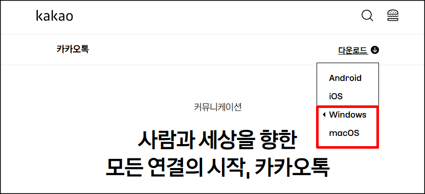 카카오톡 공식 홈페이지에 접속하면 위와 같은 메인 화면을 볼수 있습니다. 그럼 오른쪽에 있는 다운로드 버튼을 누르고 윈도우 또는 macOS 등 본인의 컴퓨터 운영체제에 맞는 설치파일을 선택하고 카카오톡 pc버전 다운로드를 시작합니다.