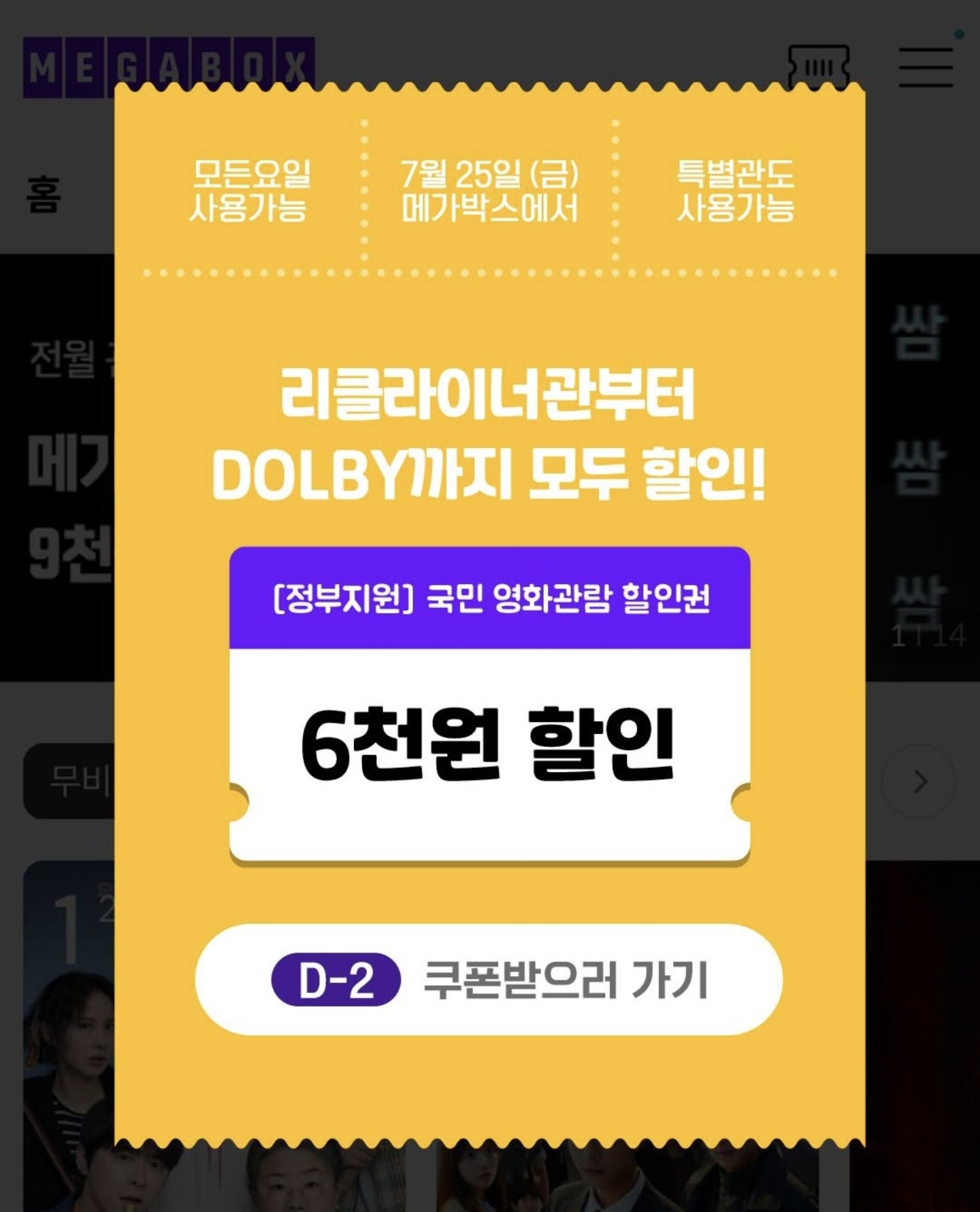 정부 영화 할인쿠폰은 1인당 최대 2매까지 발급받을 수 있고 9월 2일까지 사용할 수 있습니다. 일반관 기준으로 대부분의 영화 상영에 할인쿠폰 적용이 가능하지만 4DX, IMAX, 돌비시네마, 샤롯데관 등은 쿠폰 적용이 제한됩니다. 다만 메가박스에서만 리클라이너관과 돌비관까지 모두 6천 원 할인쿠폰이 적용되니 참고하시기 바랍니다.