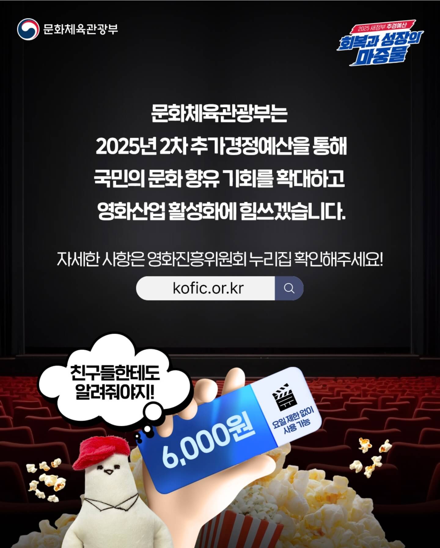 정부 영화 할인쿠폰 받는법 천 원 관람 꿀팁 총정리 해봤습니다. 이번 영화 할인 이벤트는 단순한 쿠폰 할인 그 이상인데요~ 무엇보다 영화관 4사 모두가 참여하고 있어 접근성이 높고, 문화의 날과 함께 활용하면 천 원으로 여름영화를 즐기는 특별한 방법이 됩니다. 발급 시작일을 놓치지 말고 앱과 홈페이지에 접속하여 쿠폰부터 챙기시기 바랍니다.