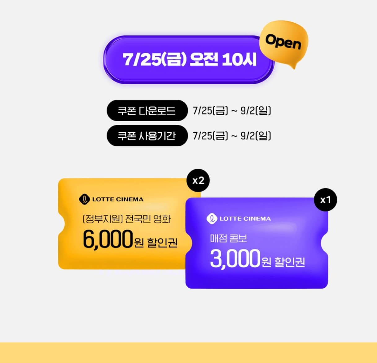 문화체육관광부와 영화진흥위원회가 지원하는 정부 영화 할인쿠폰은 총 450만 장의 6천원 할인 쿠폰을 배포하는 건데요~ 이 영화 할인쿠폰은 대표 영화관인 CGV를 비롯하여 롯데시네마, 메가박스, 씨네Q 등 주요 멀티플렉스 영화관의 공식 앱 또는 홈페이지에서 7월 25일(금) 오전 10시부터 선착순으로 발급됩니다. 정부 영화 할인쿠폰을 받기 위해서는 해당 홈페이지에 회원가입 후 로그인이 필요하고, 발급 후에는 온라인 예매 시 자동으로 적용됩니다. 무엇보다 선착순으로 발급되다 보니 조기 소진 가능성이 높으니까 발급 시간에 맞춰 빨게 접속하는 것이 중요합니다.