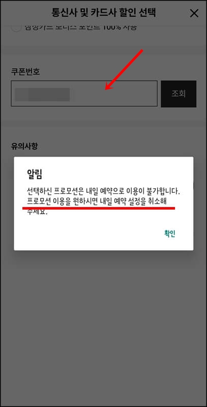 그런 다음 t월드로 가서 다운 받았던 도미노피자 할인쿠폰에 있는 쿠폰번호를 복사해서 도미노피자 주문창에 있는 쿠폰번호 입력칸에 붙여 넣기를 해줍니다. 그런데!! 저희 동네는 skt할인 쿠폰으로 내일 예약이 불가능하다고 해서 다시 오늘 날짜로 변경 후 주문을 진행해 봤습니다.