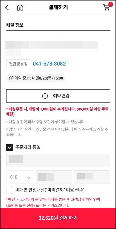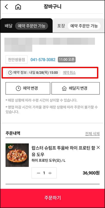 그렇게 예약설정 버튼을 누르고 도미노피자 사전예약 날짜를 선택하면 되는데 저희동네 매장은 오늘과 내일 날짜만 선택이 가능했고, 일단 내일 날짜와 시간을 선택한 뒤 배달로 주문을 진행했습니다. (배달비 3천 원 있음)