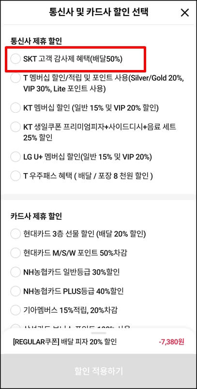 이후 개인정보 제3자 제공 동의에 체크한 뒤 확인 버튼을 누르고 통신사 제휴 할인 목록에 있는 skt 고객 감사제 혜택에 체크합니다. (개인정보 제3자 제공동의는 선택이라고 되어있지만 체크 안 하면 다음 단계로 안 넘어 감:;;)
