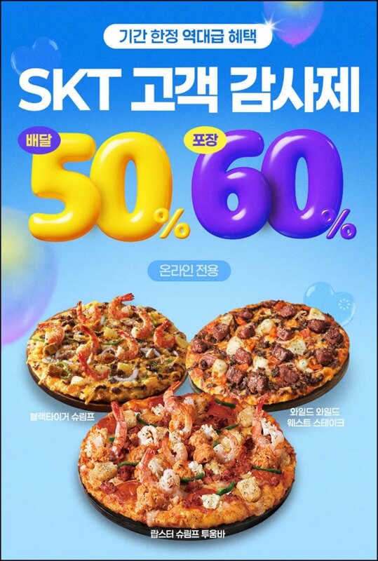 skt 고객이라면 8월이 가기 전 놓치지 아까운 혜택이 있습니다. 바로 skt 감사제 쿠폰으로 도미노피자를 무려 60%나 할인받을 수 있는 특별 이벤트인데요~ 오늘은 도미노피자 skt할인 방법과 도미노지파 사전예약 방법에 대해 정리해드릴예정이지만 지점에 따라서 예약 및 주문이 불가한 곳이 있으니 참고 바랍니다.