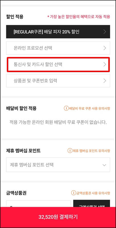 결제하기 창으로 넘어가서 주문자 정보를 입력 및 확인을 하고, 밑으로 내려가서 할인적용 메뉴에 있는 통신사 및 카드사 할인 선택버튼을 눌러줍니다.