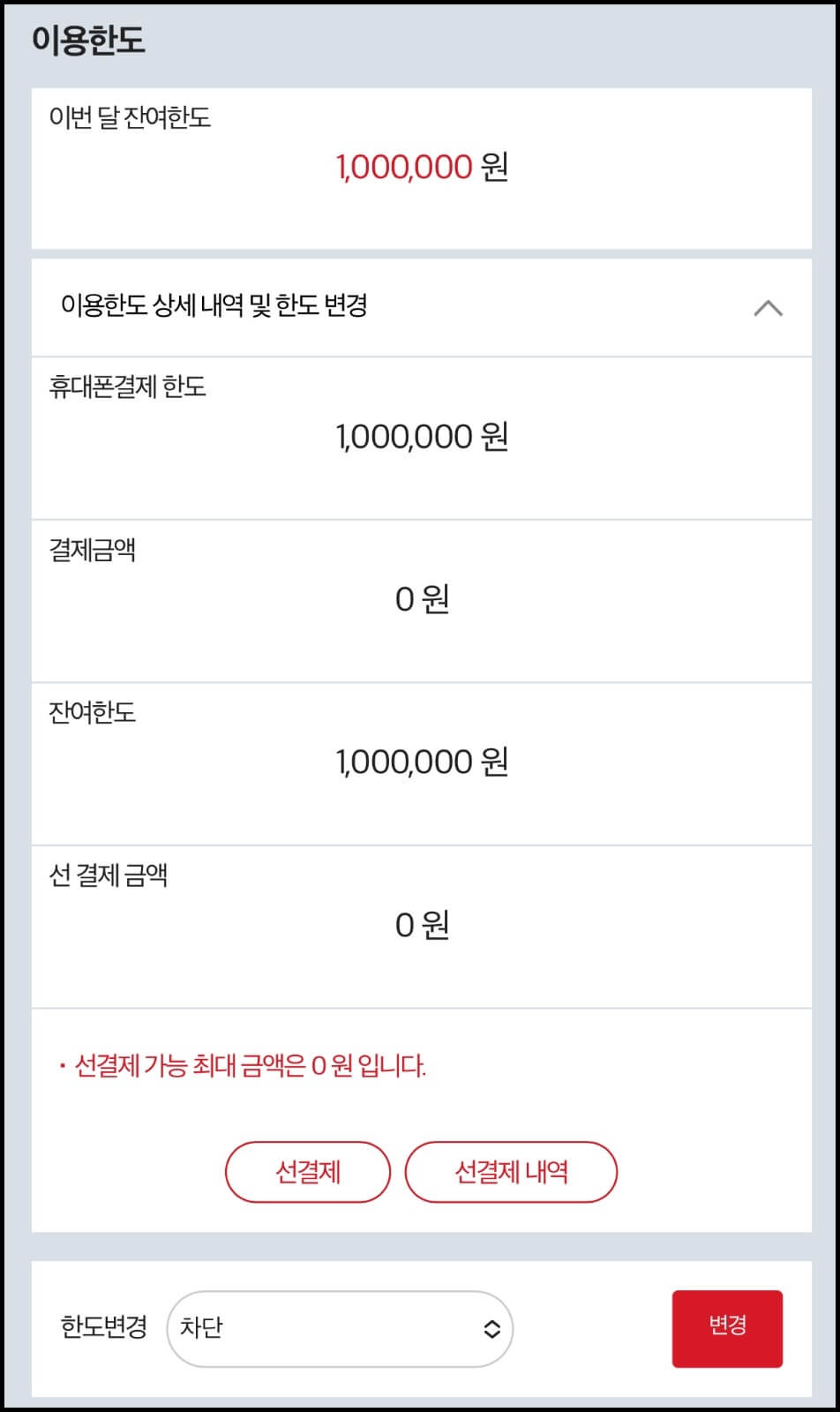 휴대폰 소액결제 서비스 이용동의가 완료되면 이용 한도를 확인할수 있고, 이용한도 상세 내역 및 한도 변경을 클릭하고, 한도 변경 또는 차단을 눌러 kt 소액결제 차단을 하면 됩니다.