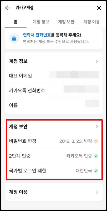카카오톡 > 상단에 있는 톱니바퀴(설정) > 전체설정 > 카카오계정 순으로 들어가서 계정보안에 있는 비밀번호를 변경하고, 2단계 인증을 활성화해놓고, 국가별 로그인 제한 또한 활성화해 놓는 것이 좋습니다.