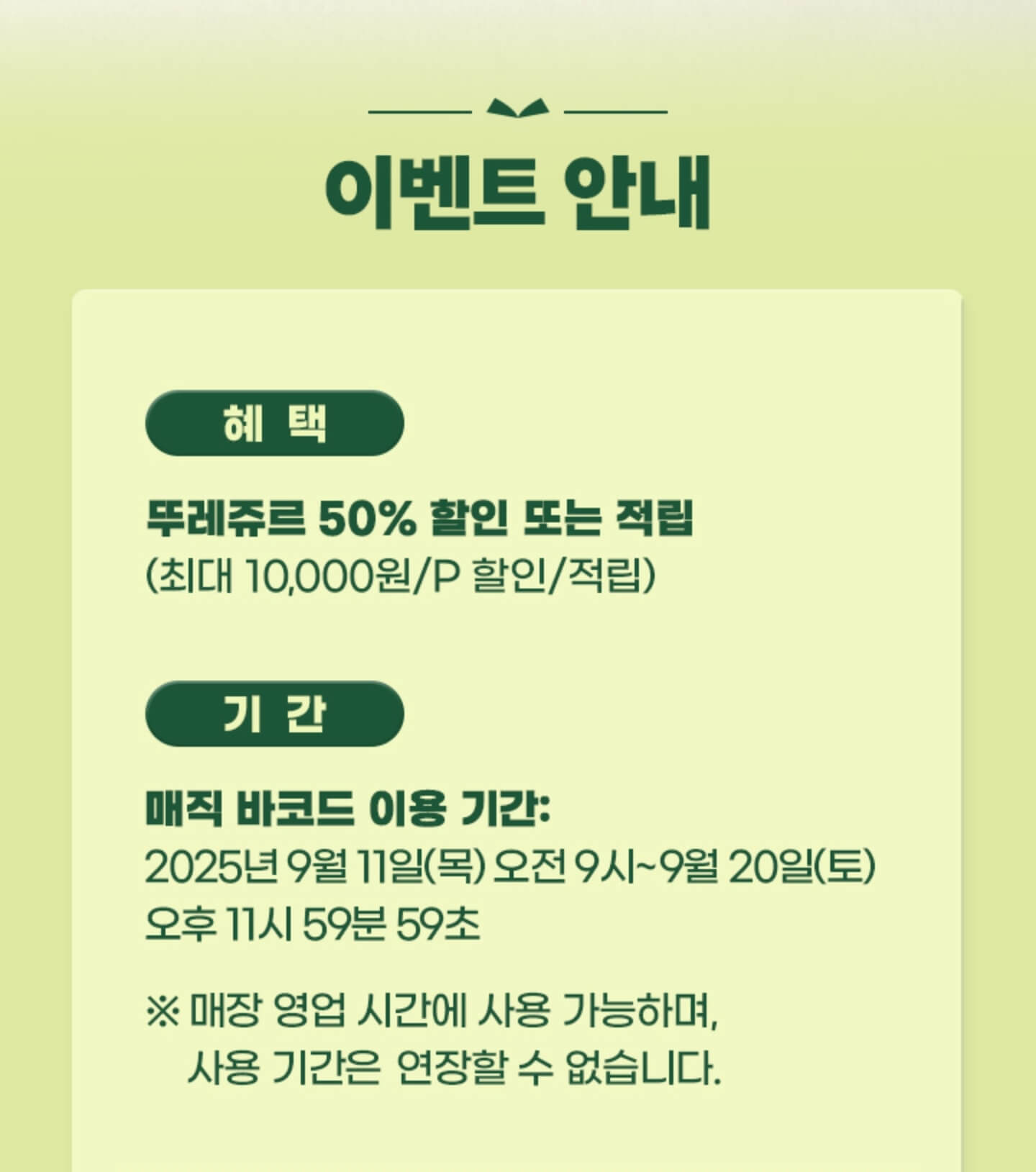 T멤버십 앱에 접속 > 고객 감사제 페이지 접속하면 매직 바코드를 볼수 있는데요~ 매장에서 직원에게 매직 바코드를 제시하기만 하면 됩니다. (별도로 다운로드할 필요가 없음) 단, 매직 바코드는 9월 11일 오전 9시부터 활성화되고, 9월 20일(토) 오후 11시 59분 59초까지만 사용이 가능하니까 해당 기간 내에 꼭 사용하시기 바랍니다.