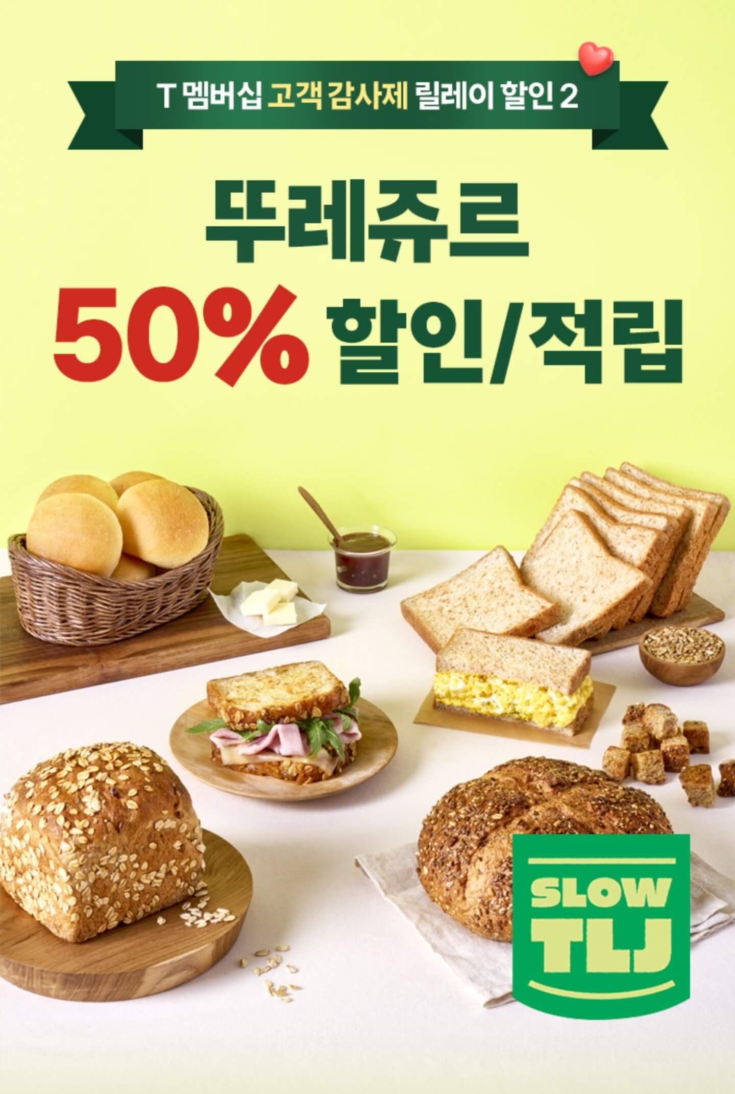 사실 SKT를 사용하고있는 고객이긴 하지만 고객감사제로 제공하고 있는 이벤트를 한 번도 사용하지 않는 분들도 계실 것 같은데요~ 연령대 상관없이 모든 고객이 편하게 받을 수 있는 혜택을 제공하면 더 좋았겠다는 아쉬움이 있기도 하지만 이왕 시작한 이벤트니까 뚜레쥬르의 맛있는 빵들을 반값에 맛볼 기회도 놓치지 마시기 바랍니다.