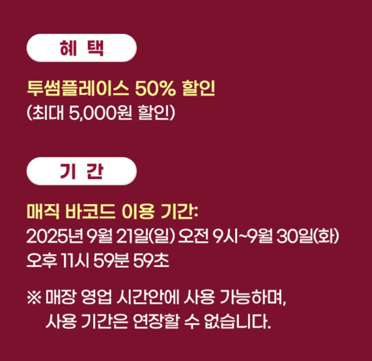 이번 skt 고객감사제 투썸 할인 혜택은 50% 할인(최대 5,000원 할인)이 제공되며 매직바코드가 생성되는 9월 21일 오전 9시부터 9월 30일(화) 오후 11시 59분 59초까지 사용이 가능합니다. 이 매직바코드는 투썸 플레이스 매장 영업 시간안에 사용할 수 있으며 사용 기간은 연장할 수 없기 때문에 사용 기간을 꼭 지키는 게 좋을 것 같습니다.