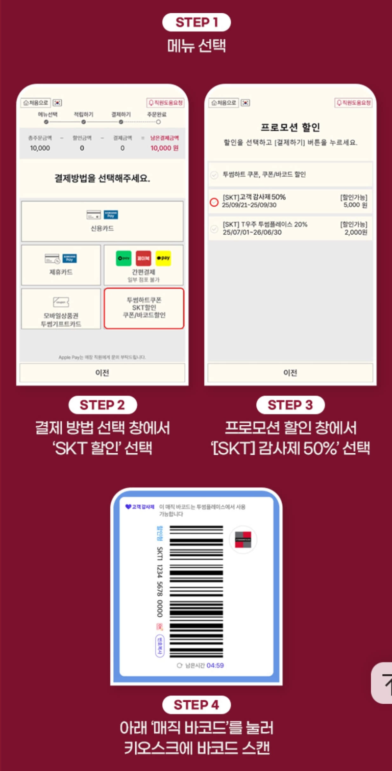 키오스크에서는 메뉴 선택 > 결제하기 > '결제 방법 선택'에서 skt 할인 버튼 > 프로모션 할인에서 skt 고객 감사제 50% 할인 > 매직 바코드 스캔 후 남은 금액을 결제하는 방식으로 사용하면 됩니다.