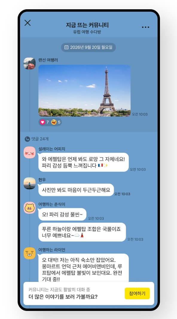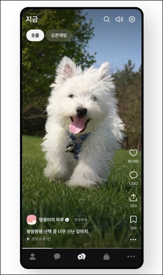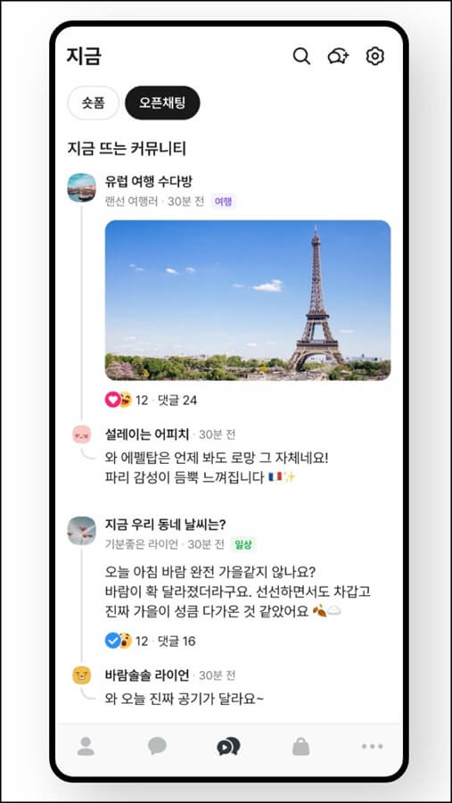 여기에 숏폼 기능이 도입되어 지금 가장 이슈 되는 콘텐츠가 노출되고, 채팅방에 입장하지 않고도 오픈채팅 커뮤니티를 통해 실시간 트렌드도 둘러볼 수 있게 되었습니다.