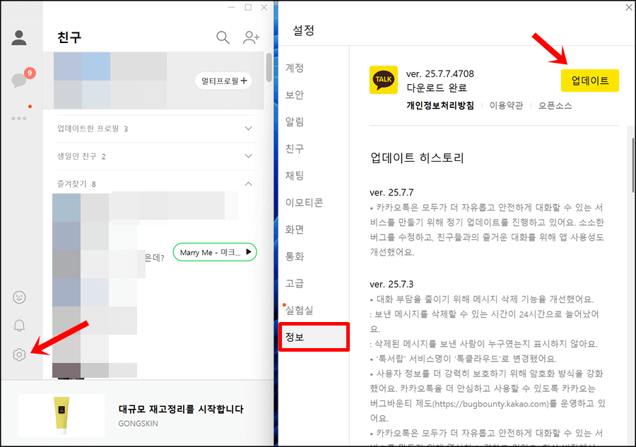 PC 같은 경우에는 카카오톡을 실행할 때 업데이트를 하라는 알림 창이 뜨거나 수동으로 해야 하기 때문에 업데이트를 원하지 않는 다면 이를 무시하면 됩니다.