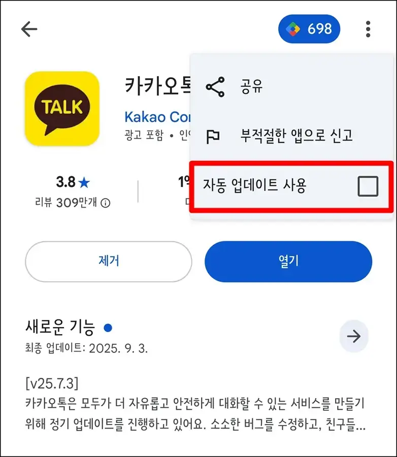 카카오톡 자동 업데이트 해제