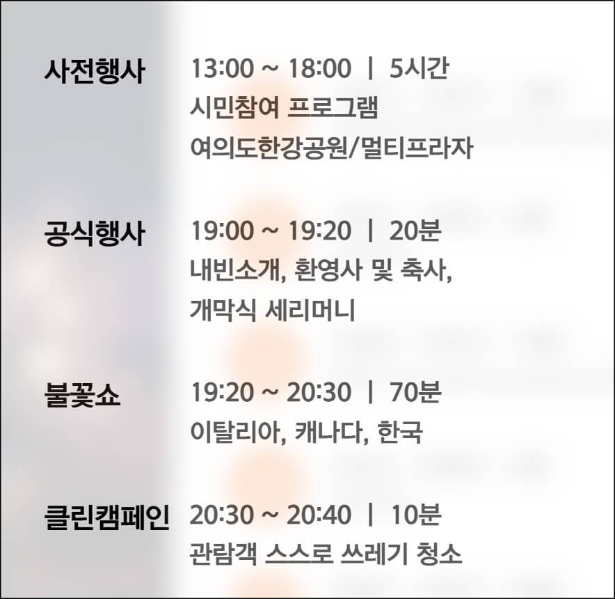 서울 불꽃축제 시간을 살펴보니까 개막식 이후 이탈리아, 캐나다팀이 7시 20분부터 순차적으로 불꽃을 선보이고, 마지막으로 한국 대표팀 한화가 약 오후 8시부터 30분동안 피날레를 장식합니다. 즉, 전체 서울 불꽃축제 시간은 대략 7시부터 9시까지 이어지며 현장에 있지 않아도 온라인 중계를 통해 관람이 가능합니다.