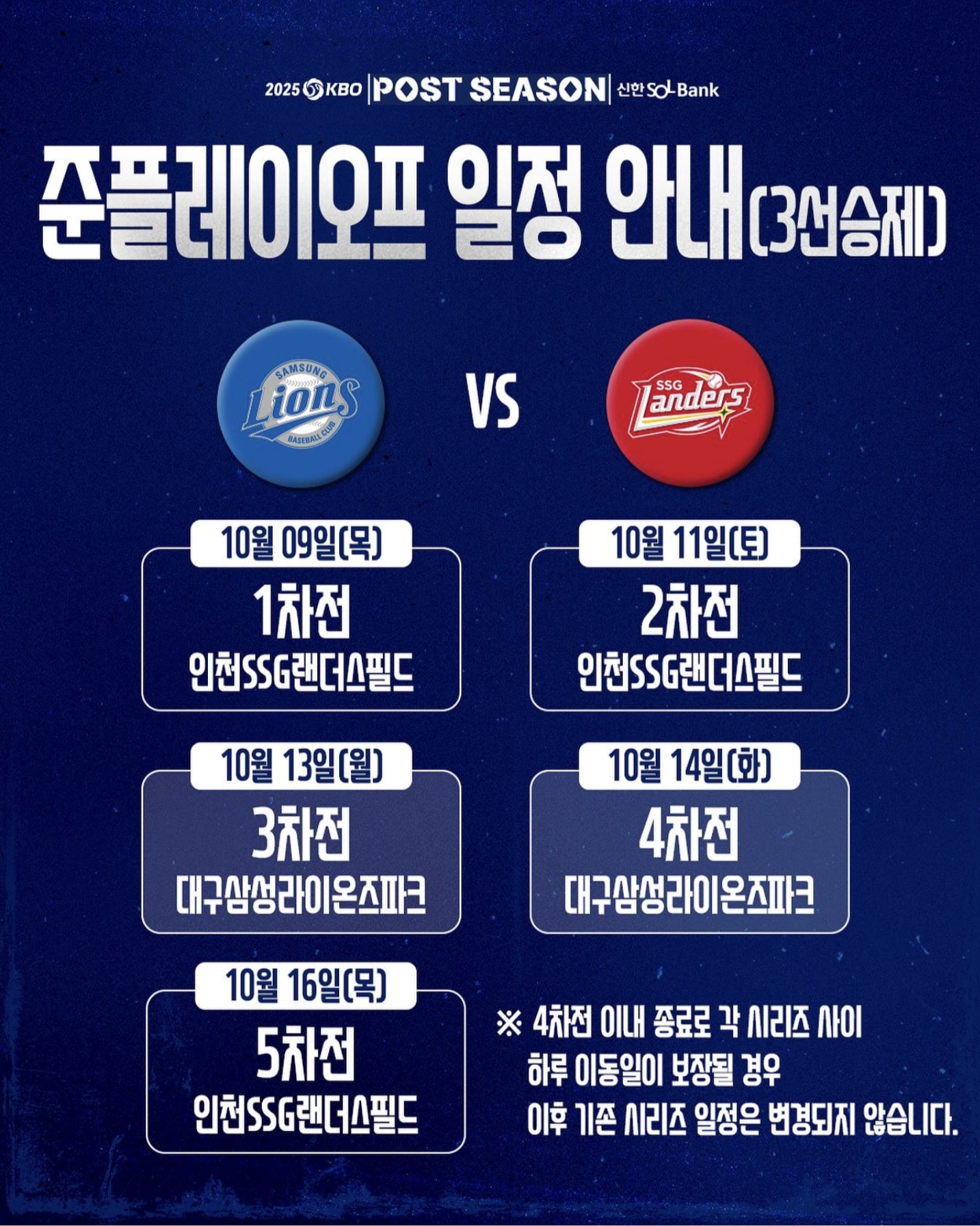 2025년 KBO 준플레이오프 일정은 10월 9일(목) 오후 2시부터 시작 됩니다. 경기는 인천 문학야구장(SSG 팬더스필드)에서 진행되며 삼성 라이온즈와 SSG랜더스가 진출해 치열한 승부를 예고하고 있습니다. 포스트시즌의 시작을 알리는 경기인만큼 양 팀 팬들의 뜨거운 응원이 기대됩니다.