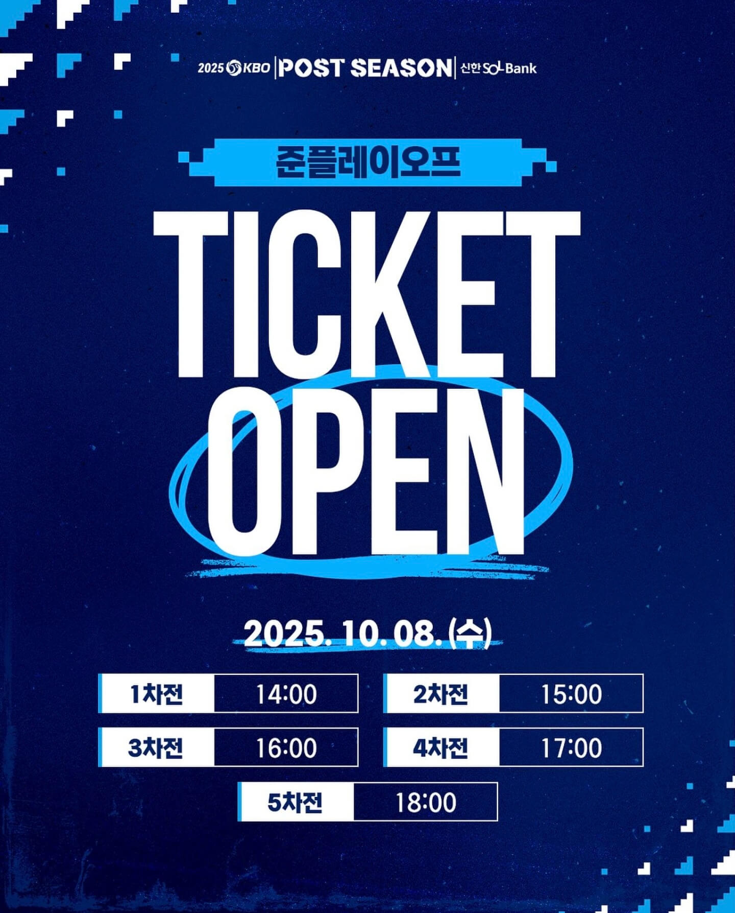 이번 준플레이오프 티켓 예매는 10월 8일(수)부터 순차적으로 시작됩니다. 1차전 준플레이오프 티켓 예매는 오후 2시부터 시작되며, 이후 매 시간대별로 2차부터 5차까지 예매가 이어집니다.